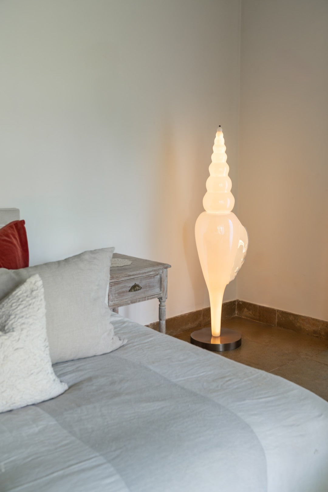 Inspired by Anahata, the unstruck and eternal sound, Ananta is a floor lamp shaped by ideas of continuity, rhythm, and calm. Its form draws from the sacred conch. Ananta feels both grounded and expansive. Its elongated, spiral silhouette echoes the ocean’s rhythm. When lit, the lamp glows softly from within.