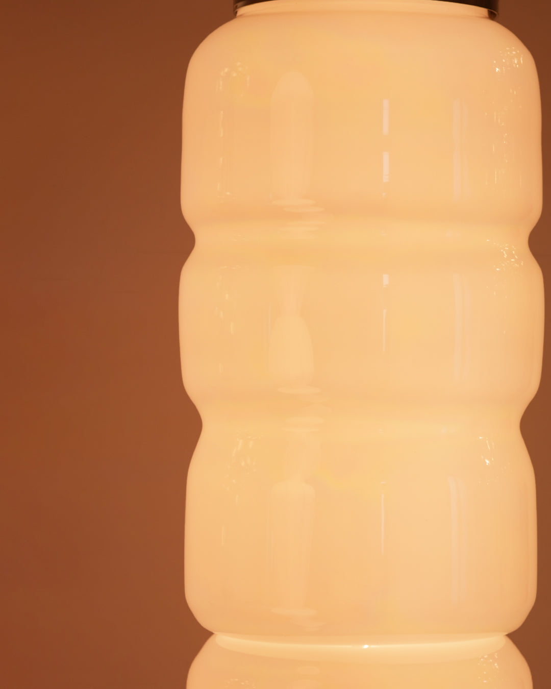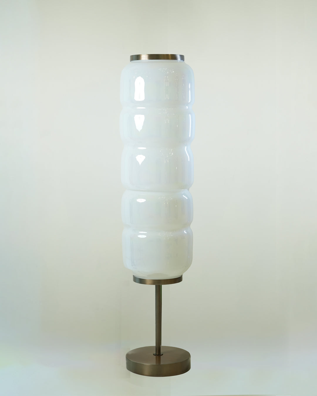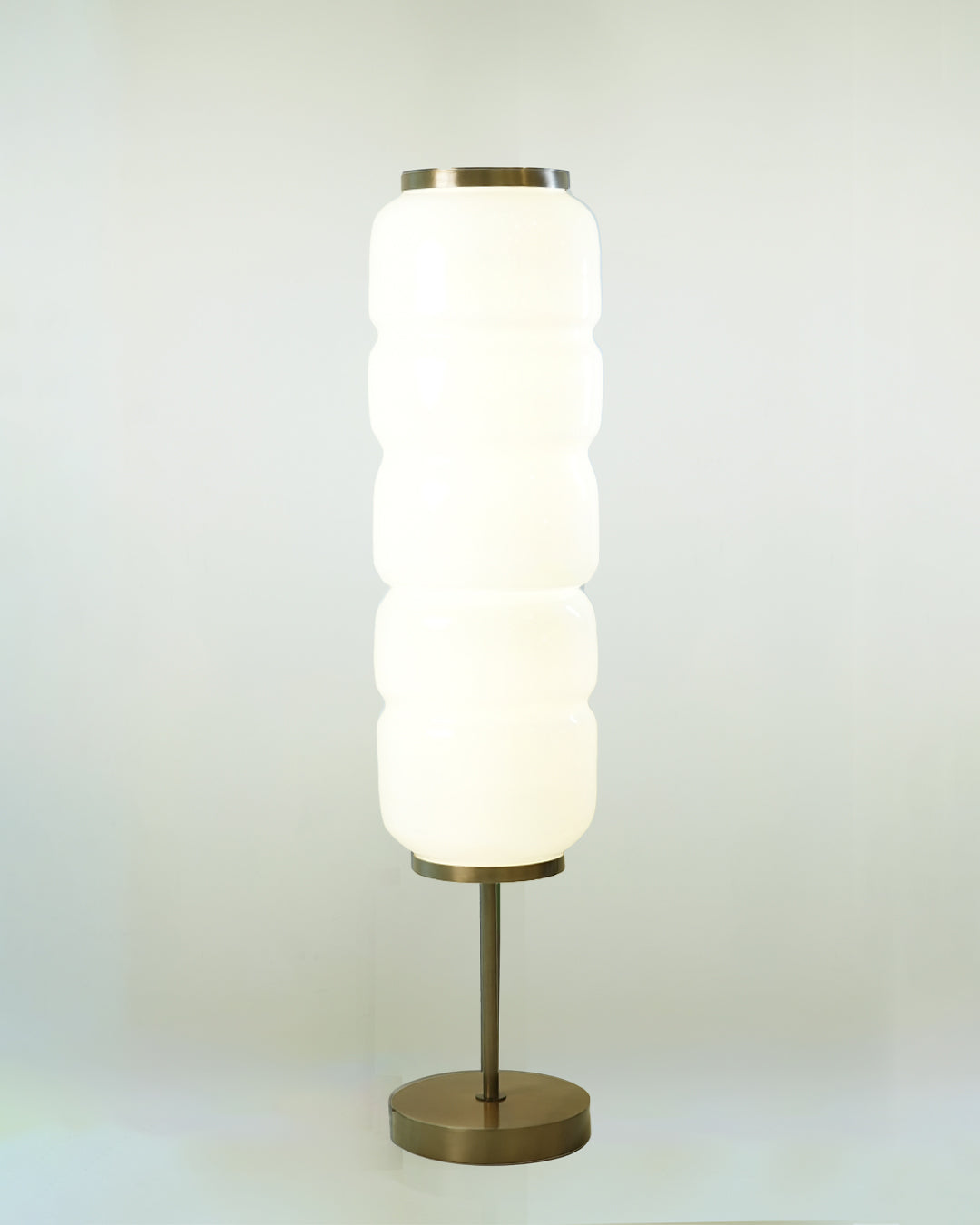 The Dhanteras Lamp is a tall floor lamp, handblown in pure white opaline with mother of pearl finish. Its cylindrical, curved form rising like sculpted pillars of light is minimal yet majestic. It radiates a soft glow that feels both calming and abundant. The form pays homage to the Kandil lamp, whose structure shapes the design of the entire collection.
