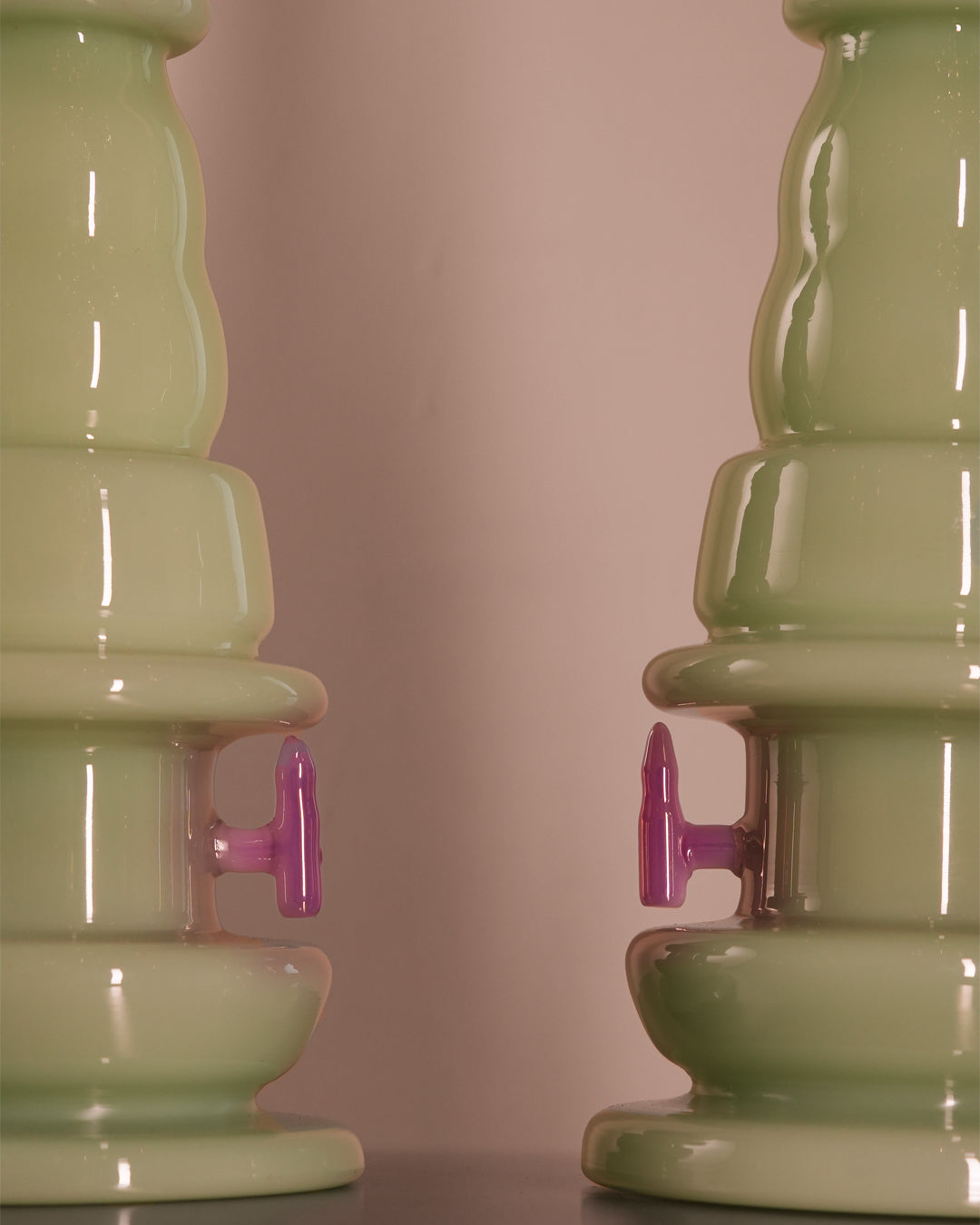Crafted in handblown glass Material: Handblown Glass Colour: Body- White Opaline MOP Finish, Jade Dimensions: Diameter: 4.5 inches Height: 10 inches Quantity: Set of 2